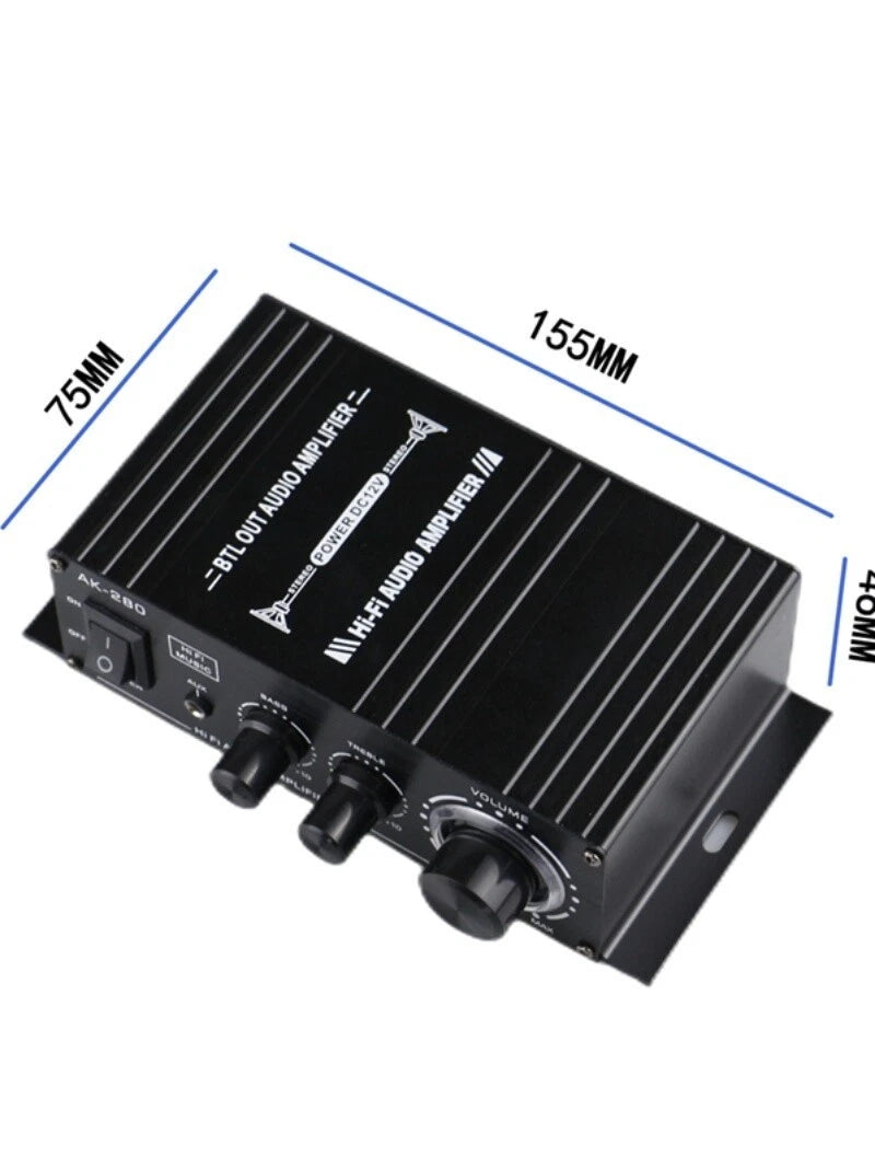 A compact and powerful mini stereo amplifier with Bluetooth, designed to deliver clear 40W + 40W sound, perfect for home audio, desktop setups, and portable music systems.